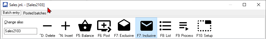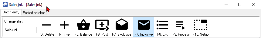 The alias is displayed directly after the batch type name in square [ ] brackets on the title bar of a selected batch type. For example, if you access the General jnl, General jnl - [General jnl] will be displayed on the title bar.