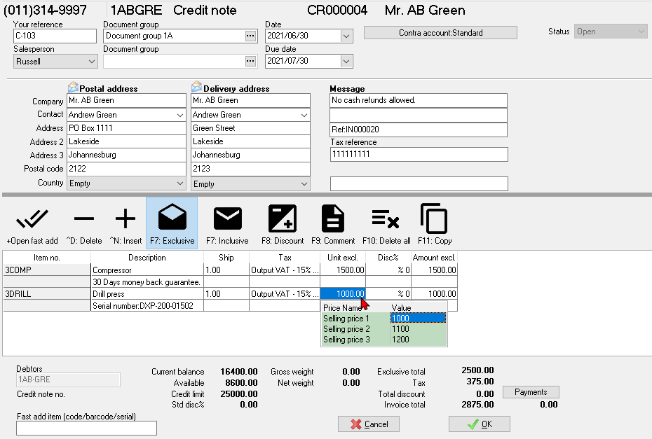 Credit notes are created for debtors (customers / clients) to correct a transaction or an exiting Invoice or to cancel the Invoice. This will generate a source document which can be printed. The Credit notes, can be edited before it is posted (updated) to the ledger.