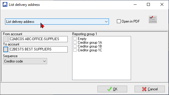 Creditor listing - Delivery address (Reports menu)