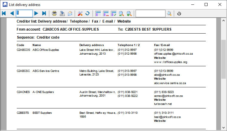 The Creditor listing - Delivery address report will list the Account code, Name of the Creditor (account description), Delivery address, Telephone 1 / 2, Fax, E-mail Address and Website.
