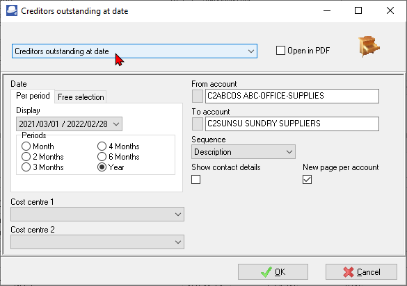 c)Sequence - Select "Creditor code" to print the report by account code or "Description" to print the report by account description (name).