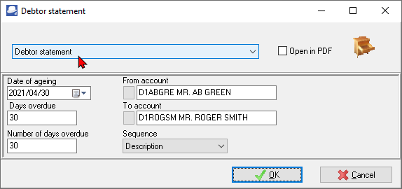 1.Select the Reports → Debtors → Outstanding menu. The "Debtor statement" report options is displayed: