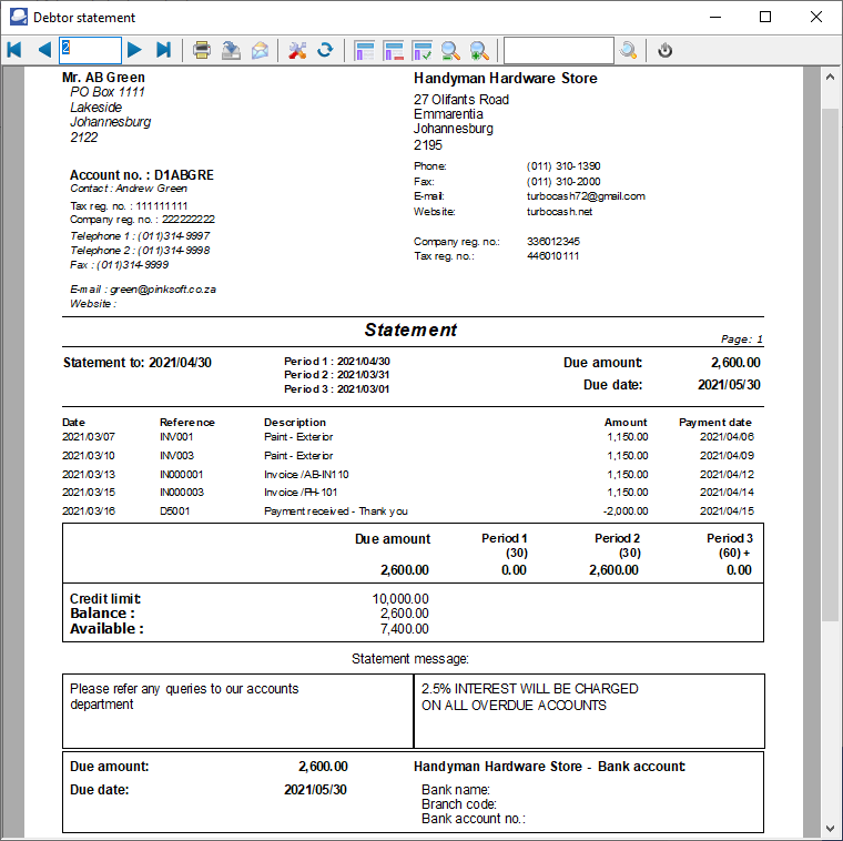 7.Due amount, Due date and Banking details - The amount payable and the date on which the payment is due. The Banking details as entered on the Setup → System parameters → Company info will be displayed on the Debtor statement.