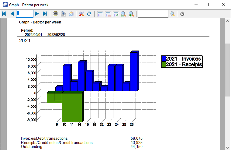 The Graph - Debtors per week displays the debit and credit transaction totals of all debtor (customer / client) accounts per week in a bar chart.