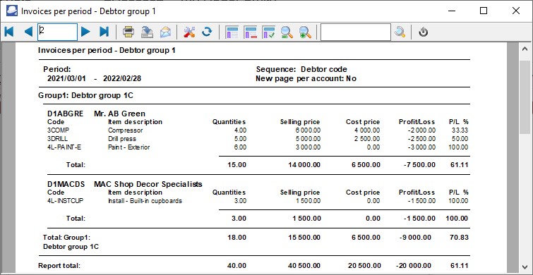 2.Invoices per period - Debtor group 2 - List the invoices by debtor (customer / client) reporting group 2 linked to debtor (customer / client) accounts on the Edit → Debtors menu.