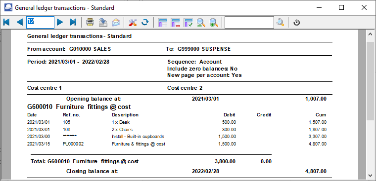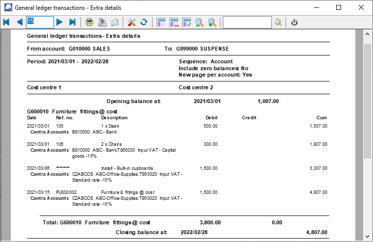 The General ledger transactions - Extra details report is similar to the General ledger transactions - Standard report, but displays extra details of the Contra accounts (i.e. Account code, Account description, Contra account code and Description as well as the Tax account code and Description). For example, " 2ABCOS ABC-Office Sup,T8650020, Input VAT-Standard rate - 15% ", etc.