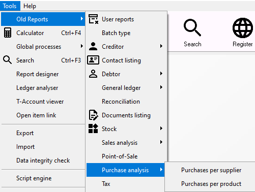 1.Click on the Tools → Old Reports → Purchase analysis menu.
