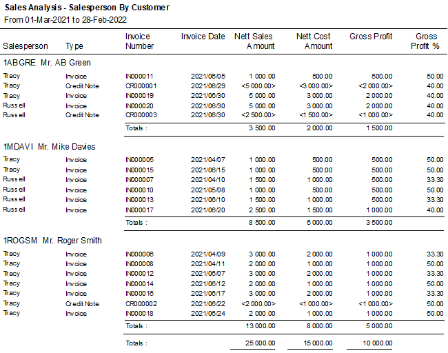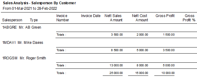 If this field is selected, the detail of the Invoices and Credit notes (the date and number), as well as the Gross Profit percentage will be displayed for each individual Invoice and Credit note. The total for each Salesperson and for each debtor (customer / client), as well as a grand total of your sales, will be displayed. |