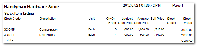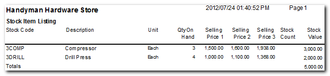 This report lists the accumulative quantities and stock values, as well as any latest and average cost prices and the selling prices for the Invoices, Credit notes, Purchase and Supplier returns documents which are updated to the ledger. You may also select to list the selling prices of a selected stock item, or a range of stock items (price list).