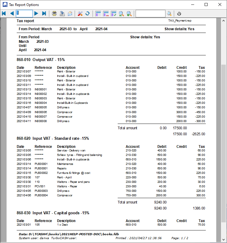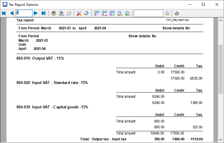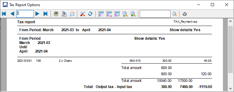 An example of the "Tax per period" ("Show details") report, is as follows: