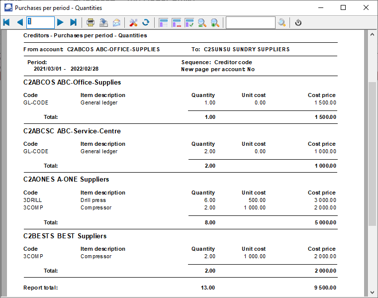 An example of the "Creditors - Purchases per period - Quantities" report, is as follows: