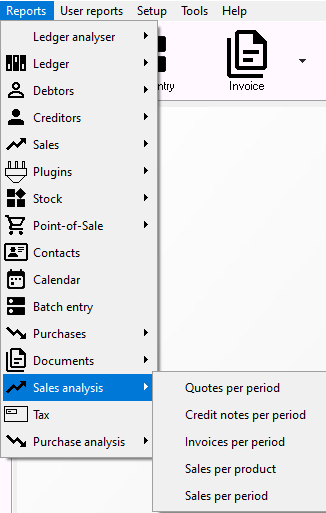 Various reports are available on the Reports → Sales analysis menu to analyse sales documents.