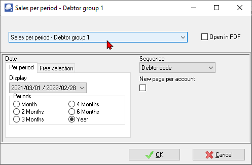 a)Report - Select the Sales per period - Debtor group 1 (default), Sales per period - Debtor group 2, Sales per period - Document group 1, Sales per period - Document group 2 or Sales per period - Salesperson report.