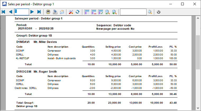 1.Sales per period - Debtor group 1 - List the invoices by debtor (customer / client) reporting group 1 linked to debtor (customer / client) accounts on the Edit → Debtors menu.