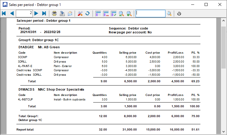 2.Sales per period - Debtor group 2 - List the invoices by debtor (customer / client) reporting group 2 linked to debtor (customer / client) accounts on the Edit → Debtors menu.
