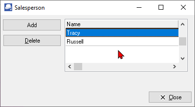 This option allows you to add / delete the salespersons, who sell your stock items or services. Salespersons may be selected on sales documents (quotes, invoices point-of-sales access and credit notes).