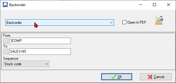 The backorder report will display any stock items that are on backorder. Backorders are usually added for the difference on the Quantity Order and Quantity Shipped fields on the Document entry screen. When processing invoices and credit notes, and a backorder exists for the debtor (customer / client) a screen on which you may select the items on backorder is displayed.