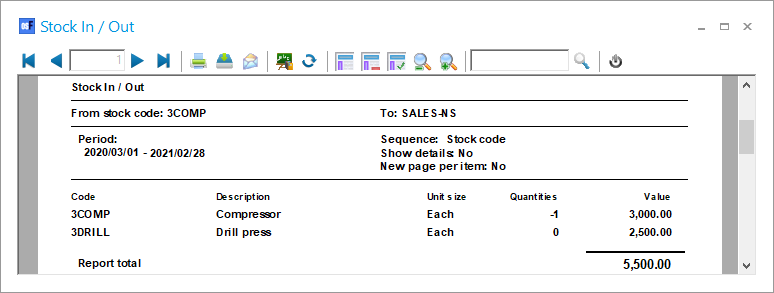 An example of the "Stock In / Out" (no details) report, is as follows: