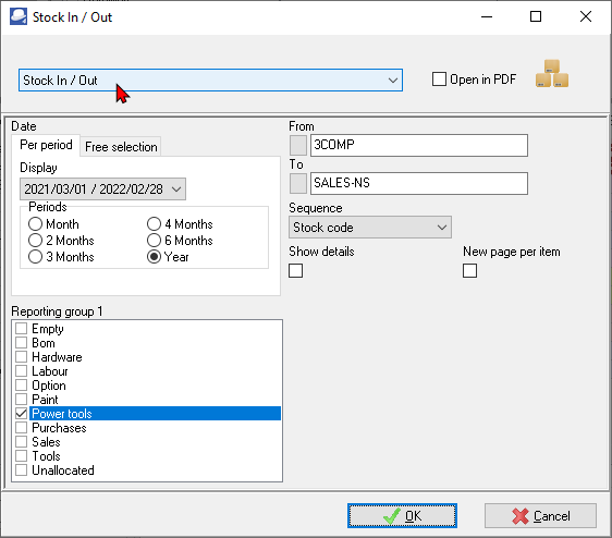 Stock In / Out - Displays a list of the stock items and the quantities in and out as well as the total prices. The details option will list and display the document dates and document numbers for each stock item.