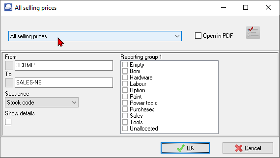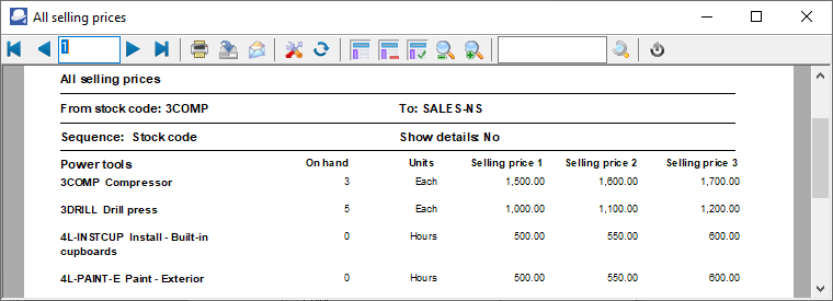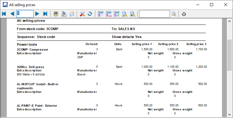 1.All selling prices - Displays a list of Selling prices 1 / 2 / 3. The details option will display the Extra description, Manufacturer, Gross and net weight.