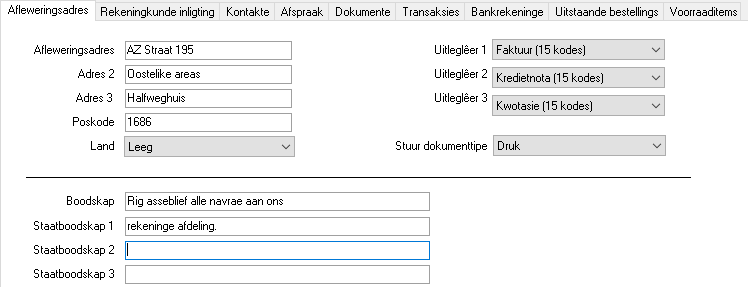 1.Afleweringsadres - Tot drie (3) reëls vir die afleweringsadres asook die poskode. Die land kan ook gekies word.