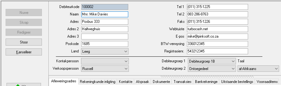 Om 'n debiteurrekening te skep, hoef u slegs die Debiteurkode en naam van die debiteur (kliënt / klant) in te sleutel. Die res van dié velde is opsioneel. Alle inligting (soveel as moontlik) behoort vir die debiteur (kliënt / klant) ingesleutel te word. Dit moet bygewerk (opgedateer) word sodra die besonderhede van die debiteur (kliënt / klant) verander.