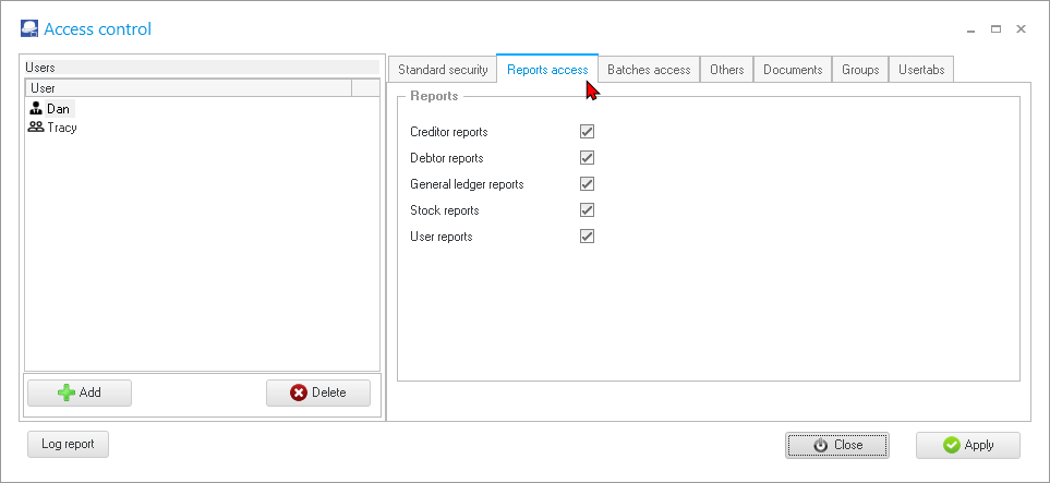 Access control - Reports access tab