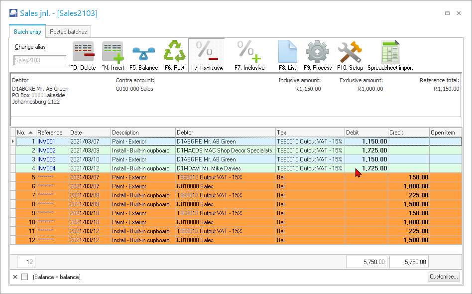 For each source document or transaction you need to enter the basic information in a row on the Batch entry screen.