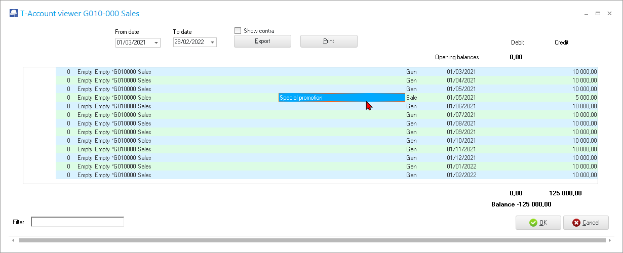 - If the Budget option is selected on the "Trial balance, Income statement", or "Balance sheet" report types in the Ledger analyser 1 or 2, you may right-click and select the Show details option. This will display the budget figures in the T-Account viewer.