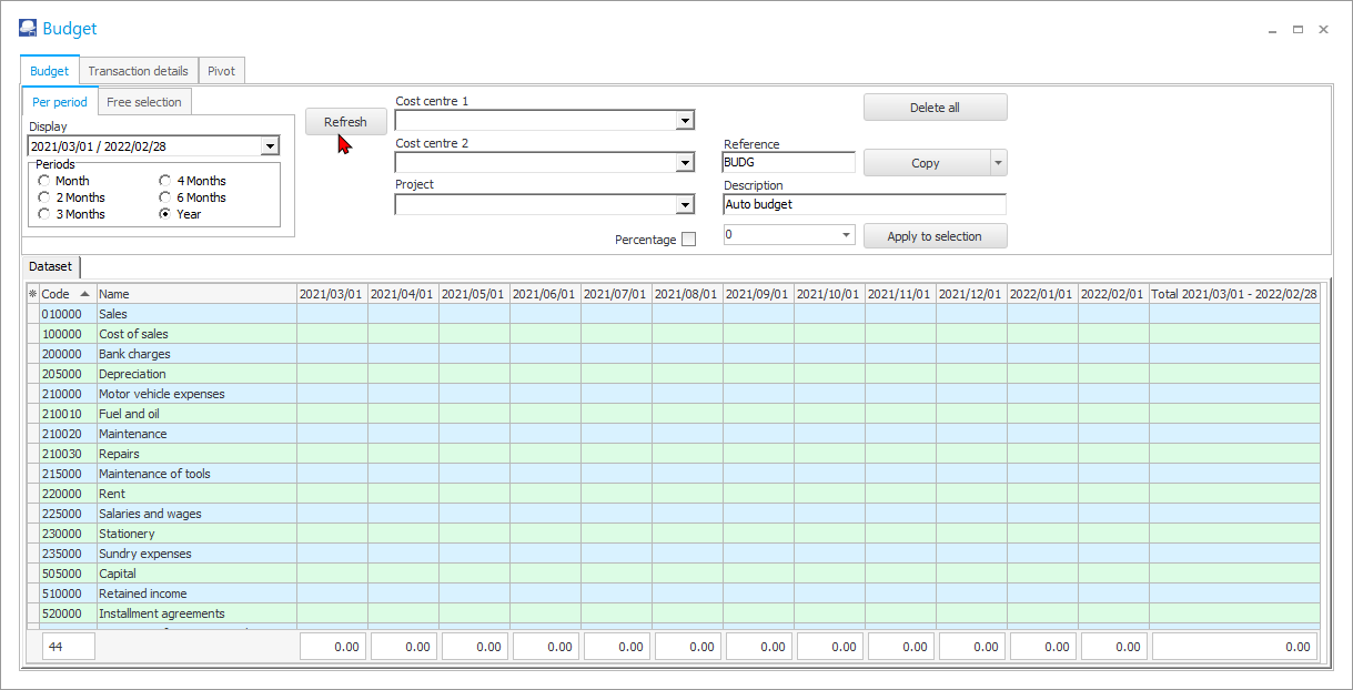 - Refresh - This button will populate the Budget figures for the selected period or selected dates.
