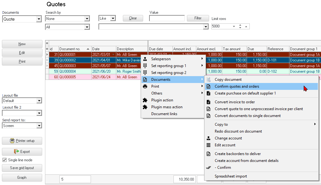 The Documents → Confirm quotes and orders option on the context menu, is only available, if the Quotes or Orders document type is selected. |