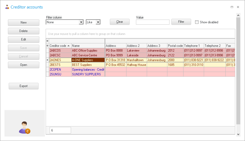 - Click on the Yes button to continue. The "Creditor accounts" screen is displayed: