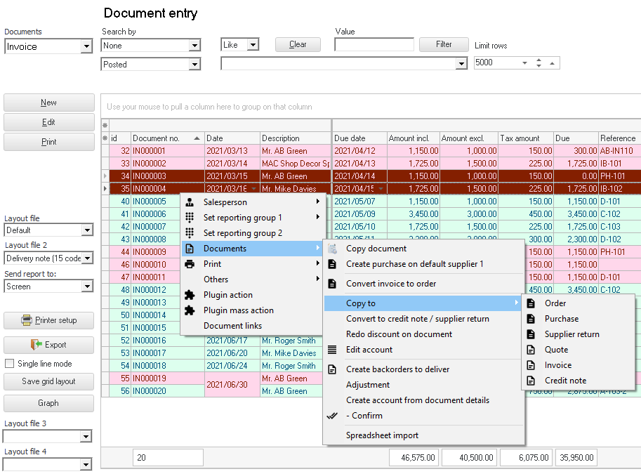 Right-click and select Documents → Copy to → Invoices, Credit notes, Quotes, Purchases, Supplier returns or Orders option on the context menu. New documents for the selected document type will be created.