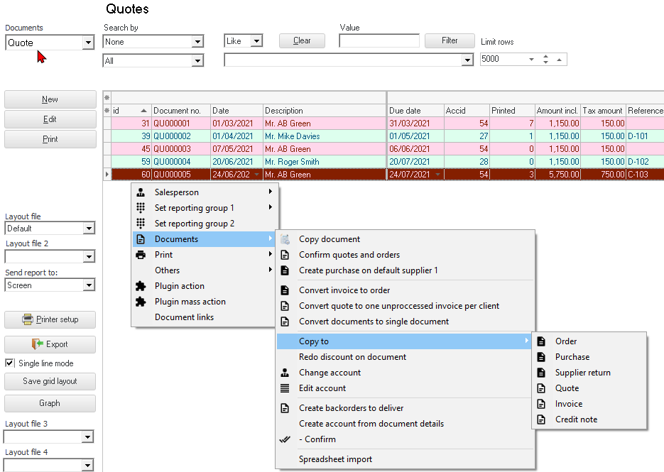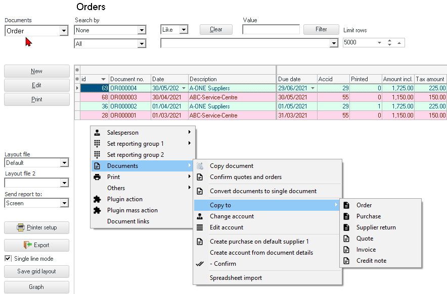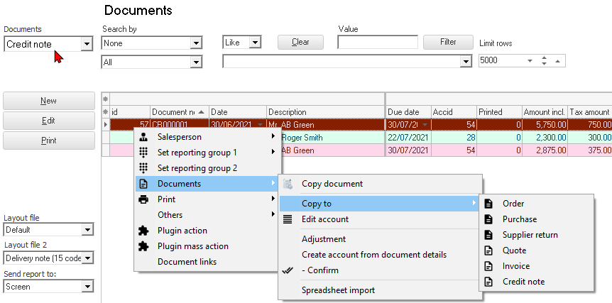 - Copy to - In addition to the Documents → Copy document option on the context menu of the "Document list" screen, to create exact copies of the selected document(s) of a specific document type, you may also copy any of the documents to another document type.