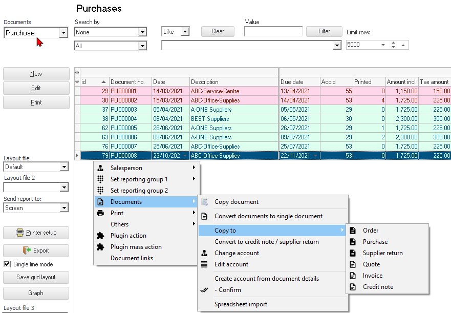 Purchases - Documents context menu