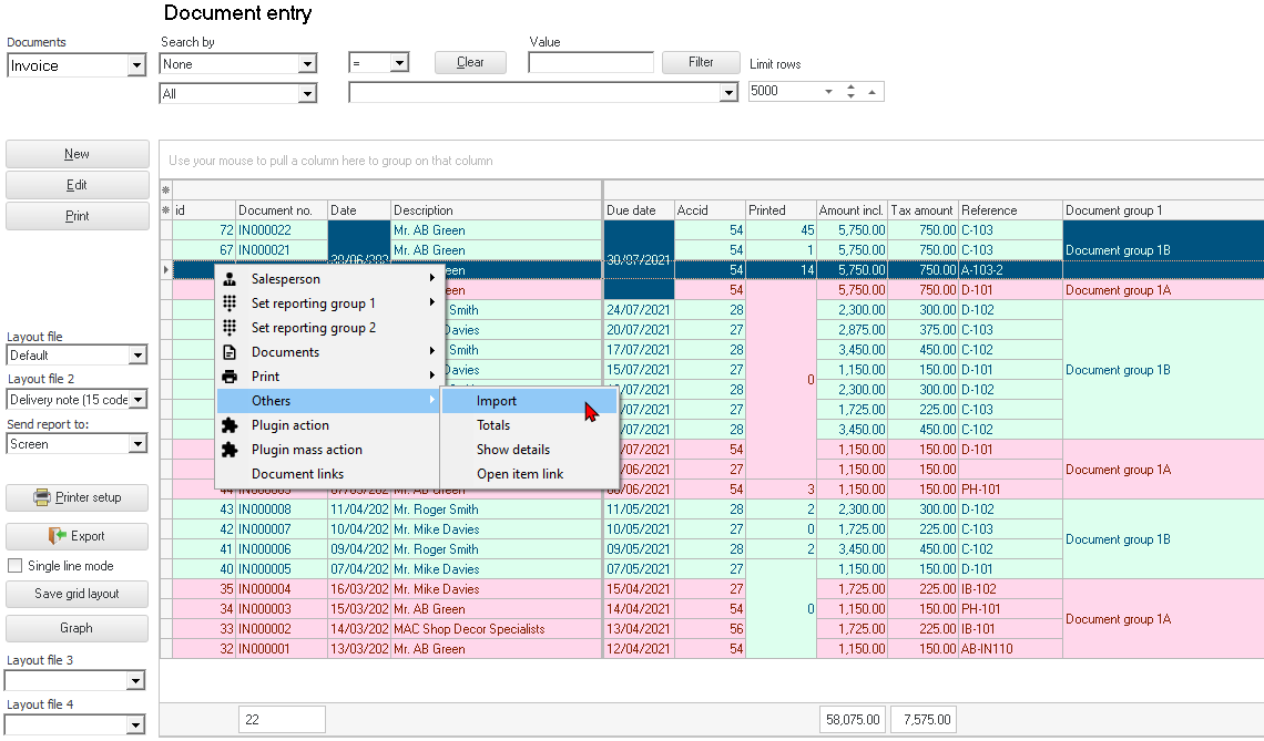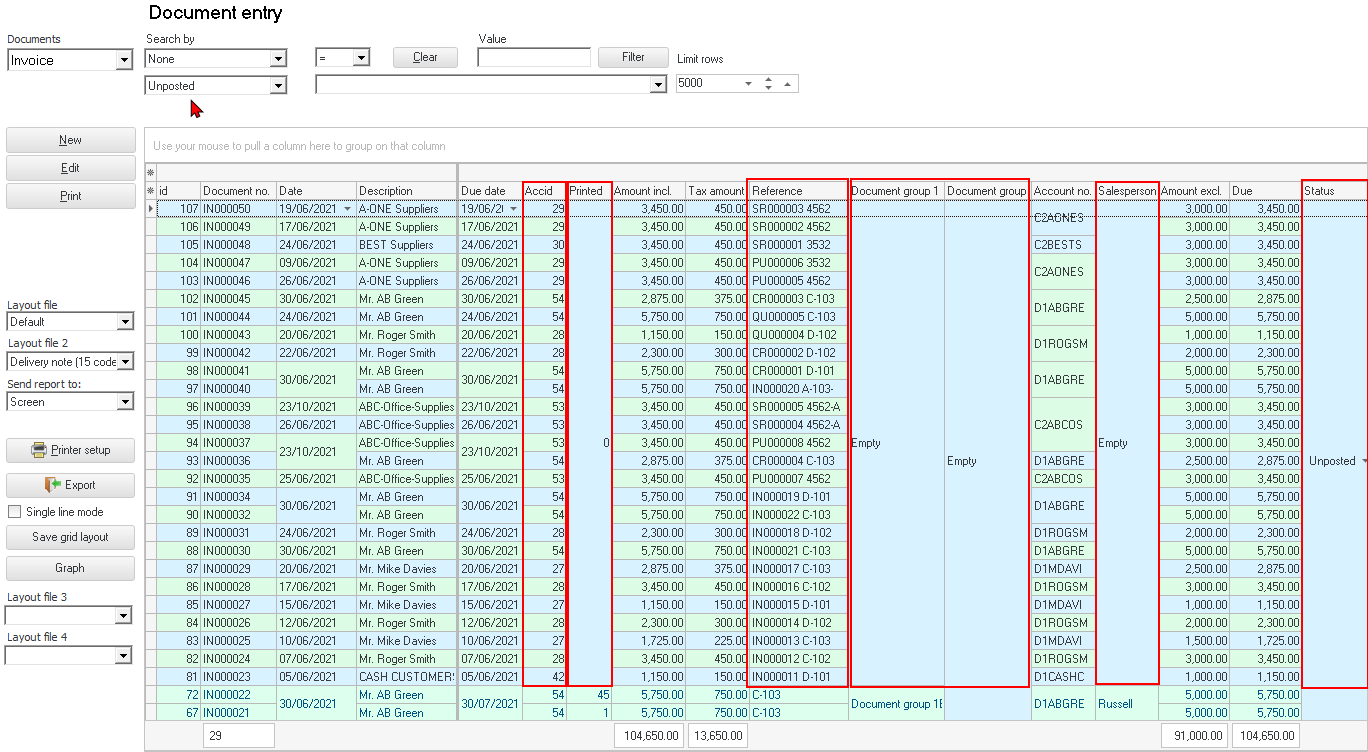 "Reference" column, the source of the exported document Document number and the "Your reference" field of the original source document will be listed. The new document numbers will be generated numerically from the last document in the Set of Books. In this example, the last existing document number ends with IN000022 and the first document imported starts with IN000023. Comments of the original source document will also be imported. Document group 1 and Document group 2 - will not be imported. Salesperson - will not be imported. Status - All documents will be imported as unposted documents. Printed - All imported documents will be imported as unprinted. |