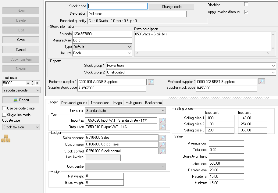 - Click on the Save button to save this stock item. The Stock item - List view - Default screen will be displayed.