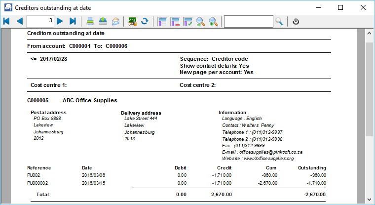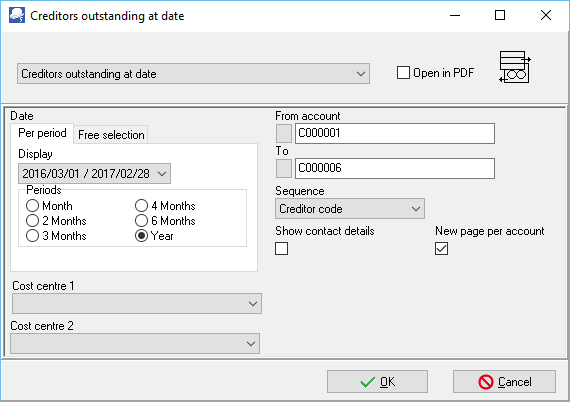 - From account ...To account - Select acreditor (supplier / vendor) account or a range of creditor (supplier / vendor) accounts, to include in the report.