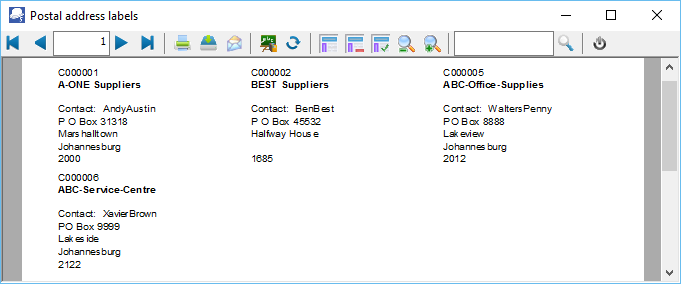 - Postal address - This will print the Account code, Account description, Contact name and Postal address for each selected creditor (supplier / vendor) account.