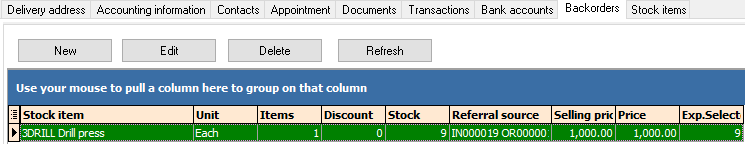 This tab will list all backorders for the debtor (customer / client) account. Backorders will automatically be listed here when processing documents or added / edited from the following options: