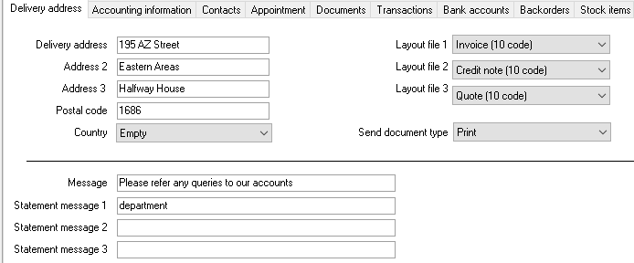 - Message, Message 1, Message 2 and Message 3 - Enter the message for the debtor (customer / client) account. This message will be displayed on Statements printed in Reports → Reports → Debtors → Statements.