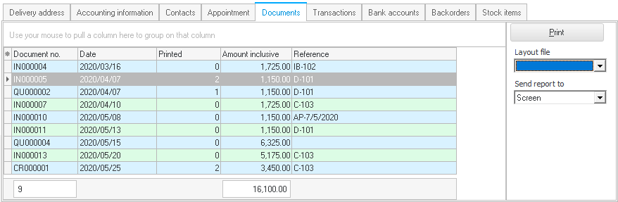 The Documents tab lists all posted and unposted documents and qoutes. The Show transact context menu option will not do anything, if a quote or an unposted document is selected. |