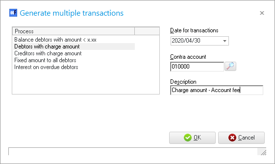- Click on the OK button. The Generate multiple transactions screen will automatically be closed, and the transactions for the Debtors which have charge amounts entered in the Accounting information tab of the Debtor account, will be imported into the selected batch.
