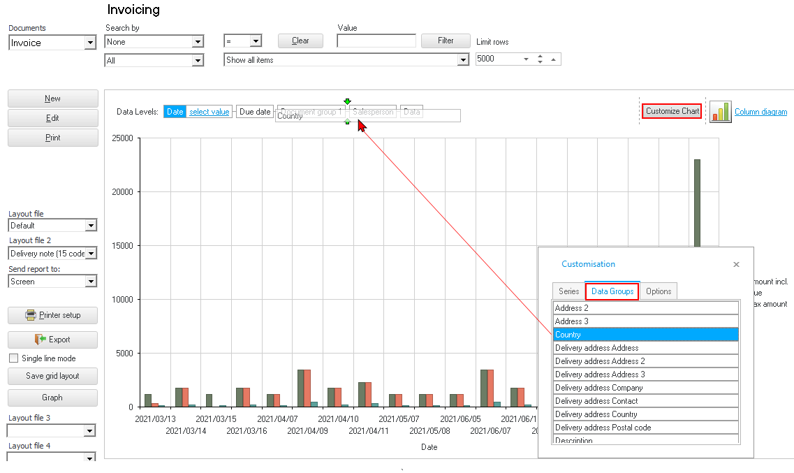 To view the documents in graph, you may use the following options for the data to be included in the graph:
