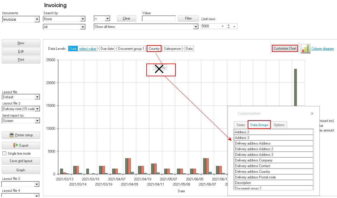 The data groups list all the available columns on the Documents grid, which is not already set as "Data Levels". You may add or remove any of the available Data Groups on the "Data Levels".