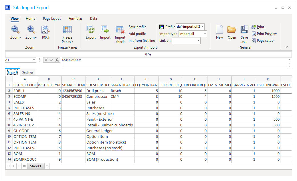- Click on the Export icon. The data from your stock code file will be imported (populated) into the spreadsheet.
