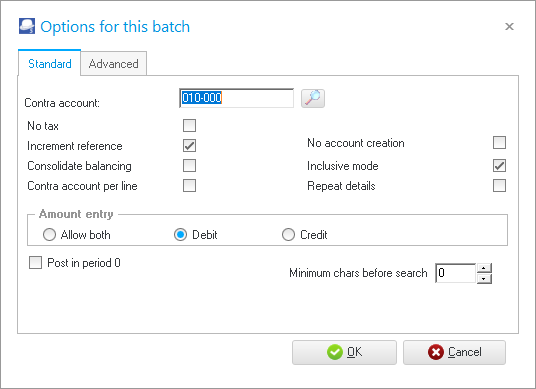 - Amount entry - This setting allows you to enable or block amount entry in the debit and / or credit columns of batches. You may select Allow Both (enter amounts in both the debit and credit column), Debit (enter amounts in the debit column only) or Credit (enter amounts in the credit column only). The recommended amount entry and lookup type settings for batch types, is as follows: