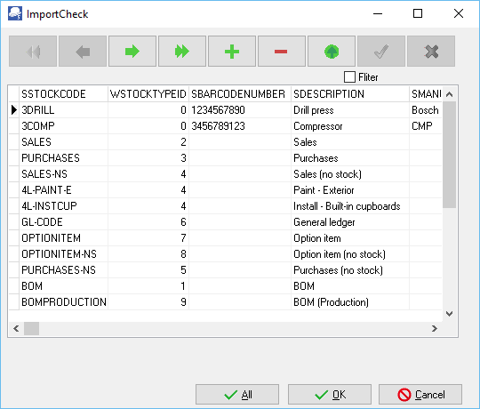 - You may use the record buttons to add, delete or change the stock records on the ImportCheck screen. You may then click on the All or OK buttons to import the stock file.