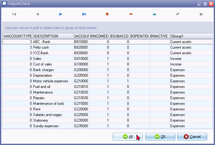 You may use the record buttons to add, delete or change the accounts on the "ImportCheck" screen. You may then click on the All or OK buttons to import the accounts. |