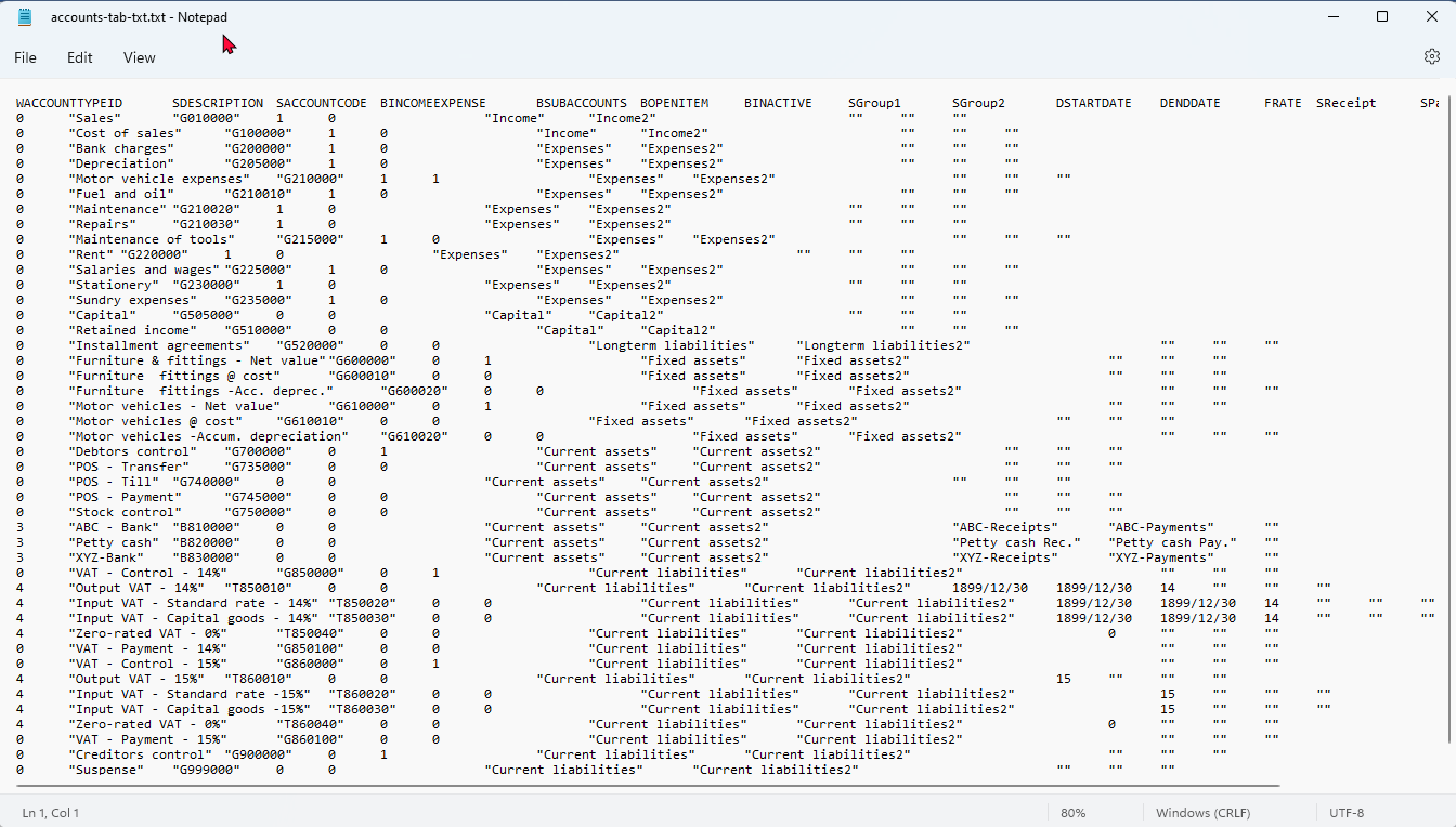 The values of the data in the "ImportCheck" screen, listing the general ledger accounts, is as follows: